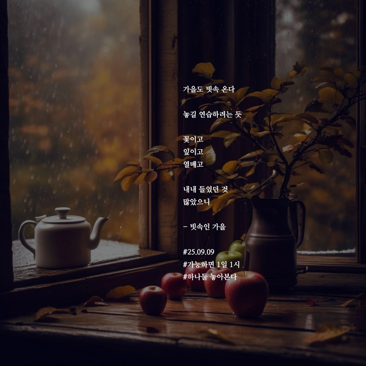 가을도 빗속 온다놓길 연습하려는 듯꽃이고잎이고열매고내내 들었던 것많았으니- 빗속인 가을#25.09.09#가능하면 1일 1시#하나둘 놓아본다