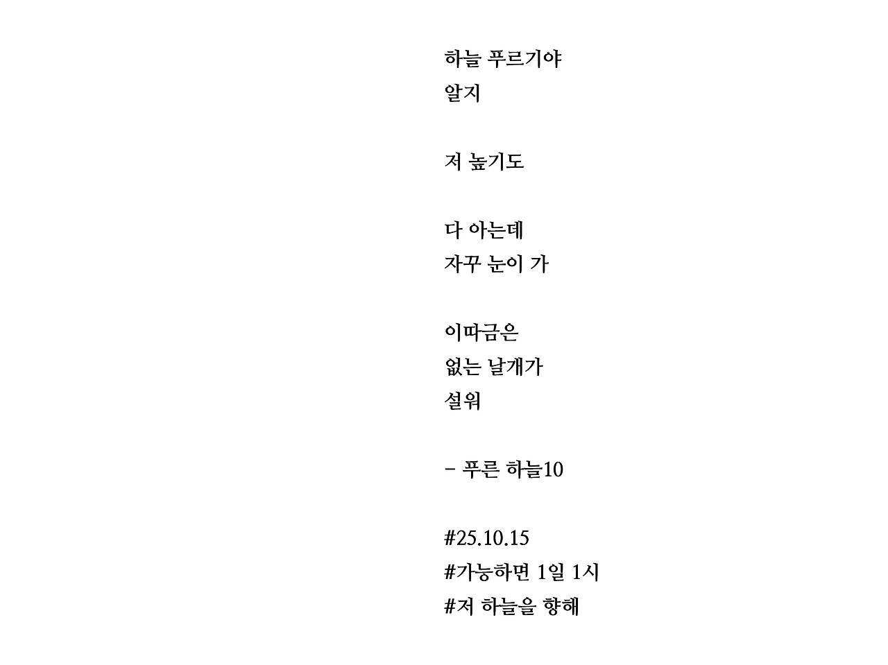 하늘 푸르기야알지저 높기도다 아는데자꾸 눈이 가이따금은없는 날개가설워- 푸른 하늘10#25.10.15#가능하면 1일 1시#저 하늘을 향해