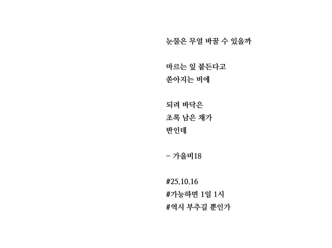 눈물은 무얼 바꿀 수 있을까마르는 잎 붙든다고쏟아지는 비에되려 바닥은초록 남은 채가반인데- 가을비18#25.10.16#가능하면 1일 1시#역시 부추길 뿐인가