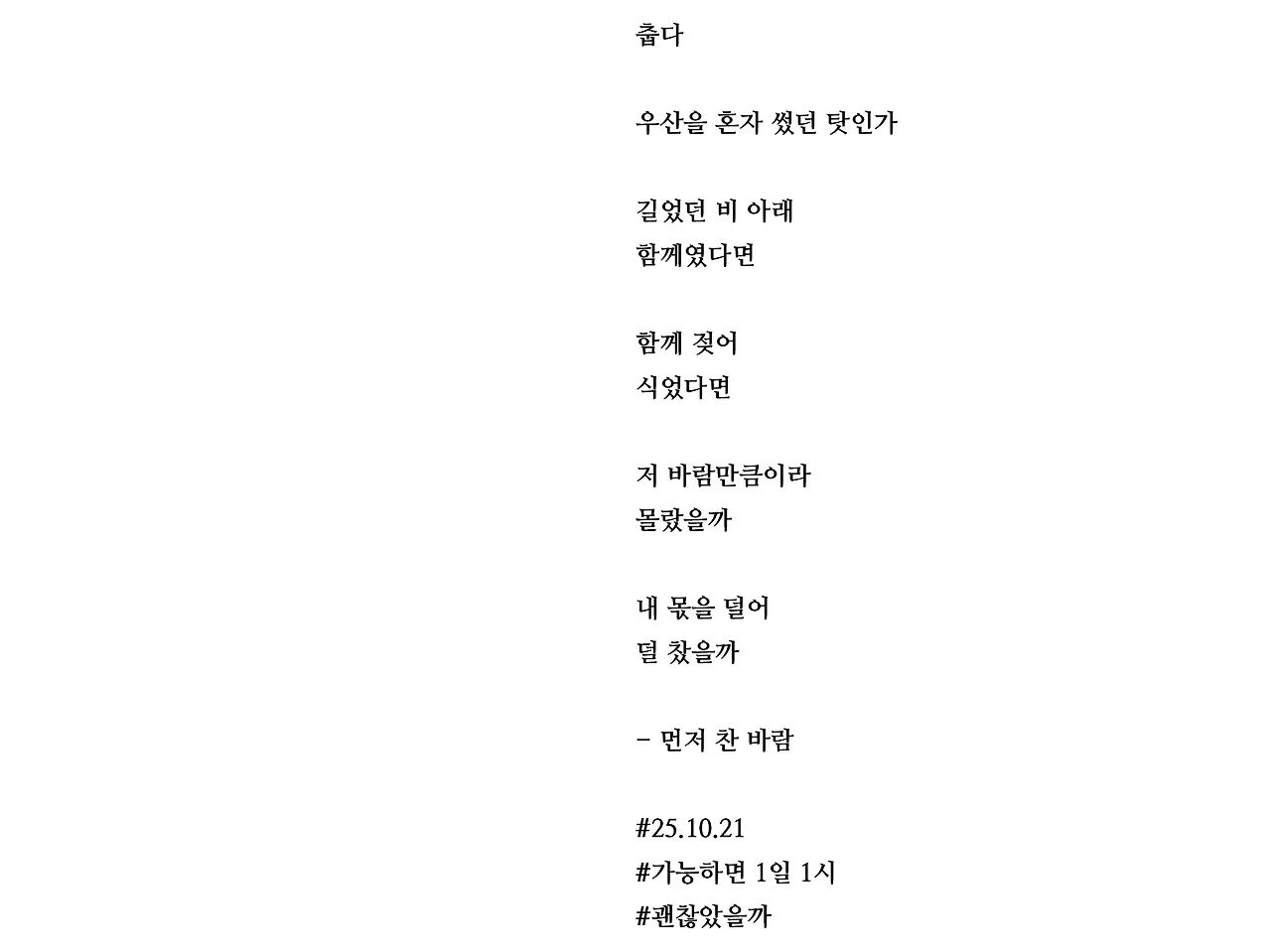 춥다우산을 혼자 썼던 탓인가길었던 비 아래함께였다면함께 젖어식었다면저 바람만큼이라몰랐을까내 몫을 덜어덜 찼을까- 먼저 찬 바람#25.10.21#가능하면 1일 1시#괜찮았을까