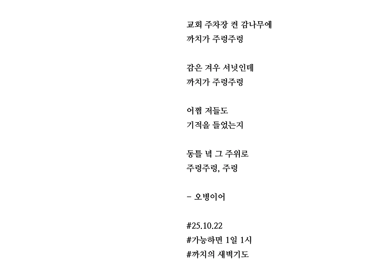 교회 주차장 켠 감나무에까치가 주렁주렁감은 겨우 서넛인데까치가 주렁주렁어쩜 저들도기적을 들었는지동틀 녘 그 주위로주렁주렁, 주렁- 오병이어#25.10.22#가능하면 1일 1시#까치의 새벽기도