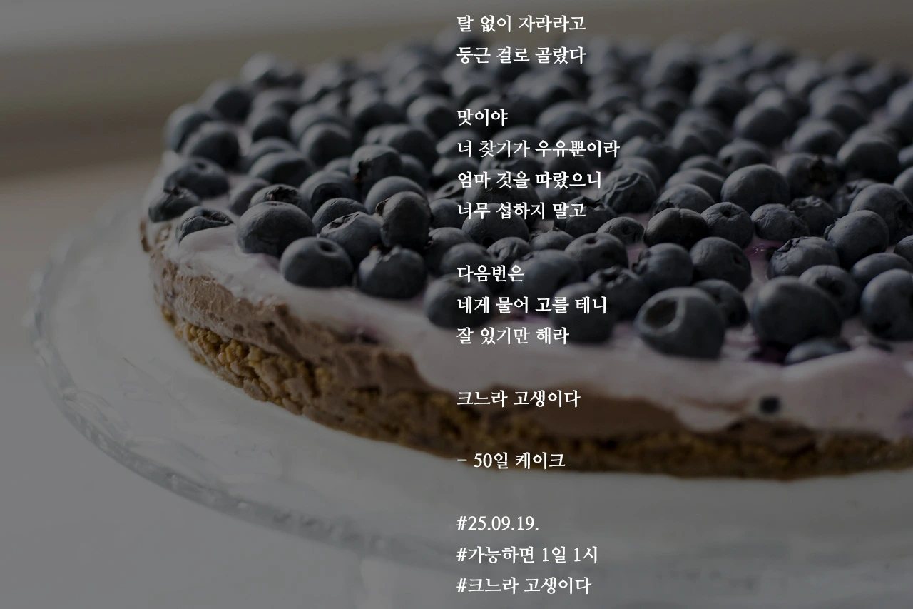 탈 없이 자라라고둥근 걸로 골랐다맛이야너 찾기가 우유뿐이라엄마 것을 따랐으니너무 섭하지 말고다음번은네게 물어 고를 테니잘 있기만 해라크느라 고생이다- 50일 케이크#25.09.19.#가능하면 1일 1시#크느라 고생이다 작가의 말: 그래도 그새 자라 뒤집기까지