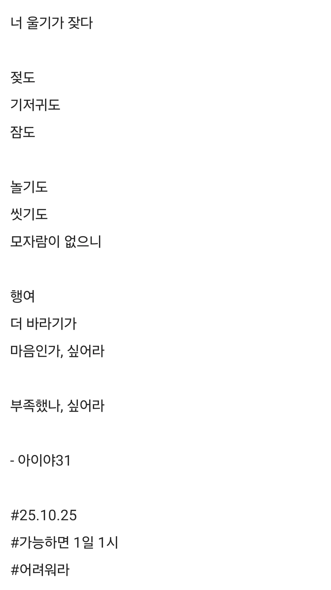 너 울기가 잦다젖도기저귀도잠도놀기도씻기도모자람이 없으니행여더 바라기가마음인가, 싶어라부족했나, 싶어라- 아이야31#25.10.25#가능하면 1일 1시#어려워라