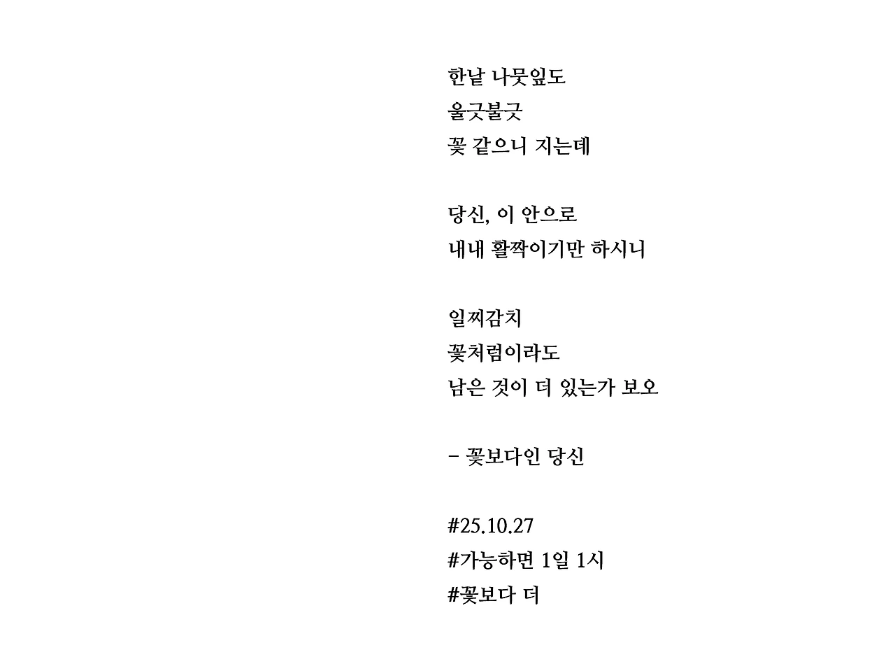 한낱 나뭇잎도울긋불긋꽃 같으니 지는데당신, 이 안으로내내 활짝이기만 하시니일찌감치꽃처럼이라도남은 것이 더 있는가 보오- 꽃보다인 당신#25.10.27#가능하면 1일 1시#꽃보다 더