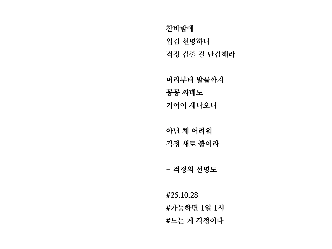 찬바람에입김 선명하니걱정 감출 길 난감해라머리부터 발끝까지꽁꽁 싸매도기어이 새나오니아닌 체 어려워걱정 새로 붙어라- 걱정의 선명도#25.10.28#가능하면 1일 1시#느는 게 걱정이다