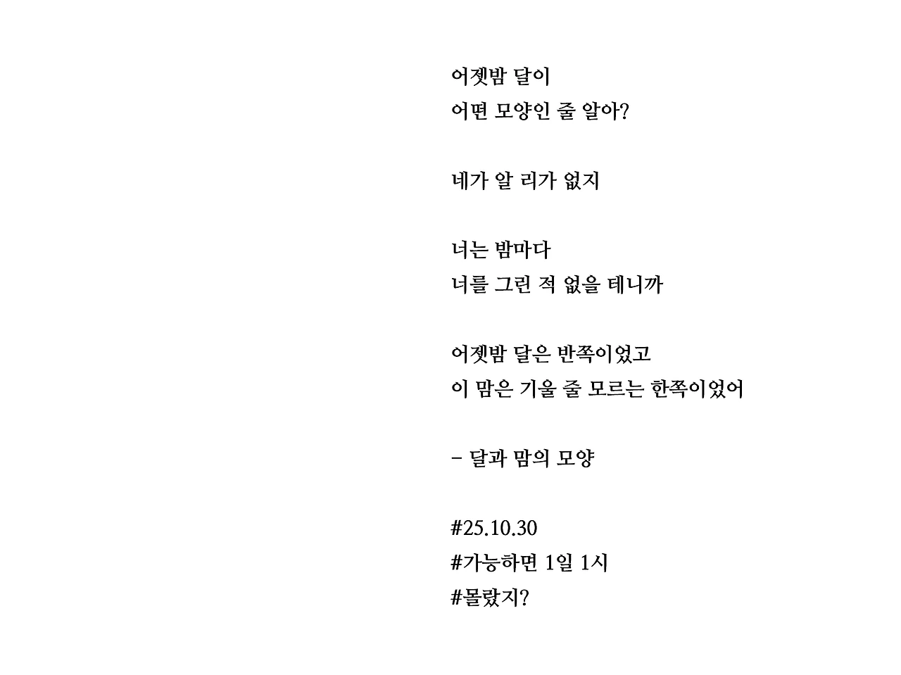어젯밤 달이어떤 모양인 줄 알아?네가 알 리가 없지너는 밤마다너를 그린 적 없을 테니까어젯밤 달은 반쪽이었고이 맘은 기울 줄 모르는 한쪽이었어- 달과 맘의 모양#25.10.30#가능하면 1일 1시#몰랐지?