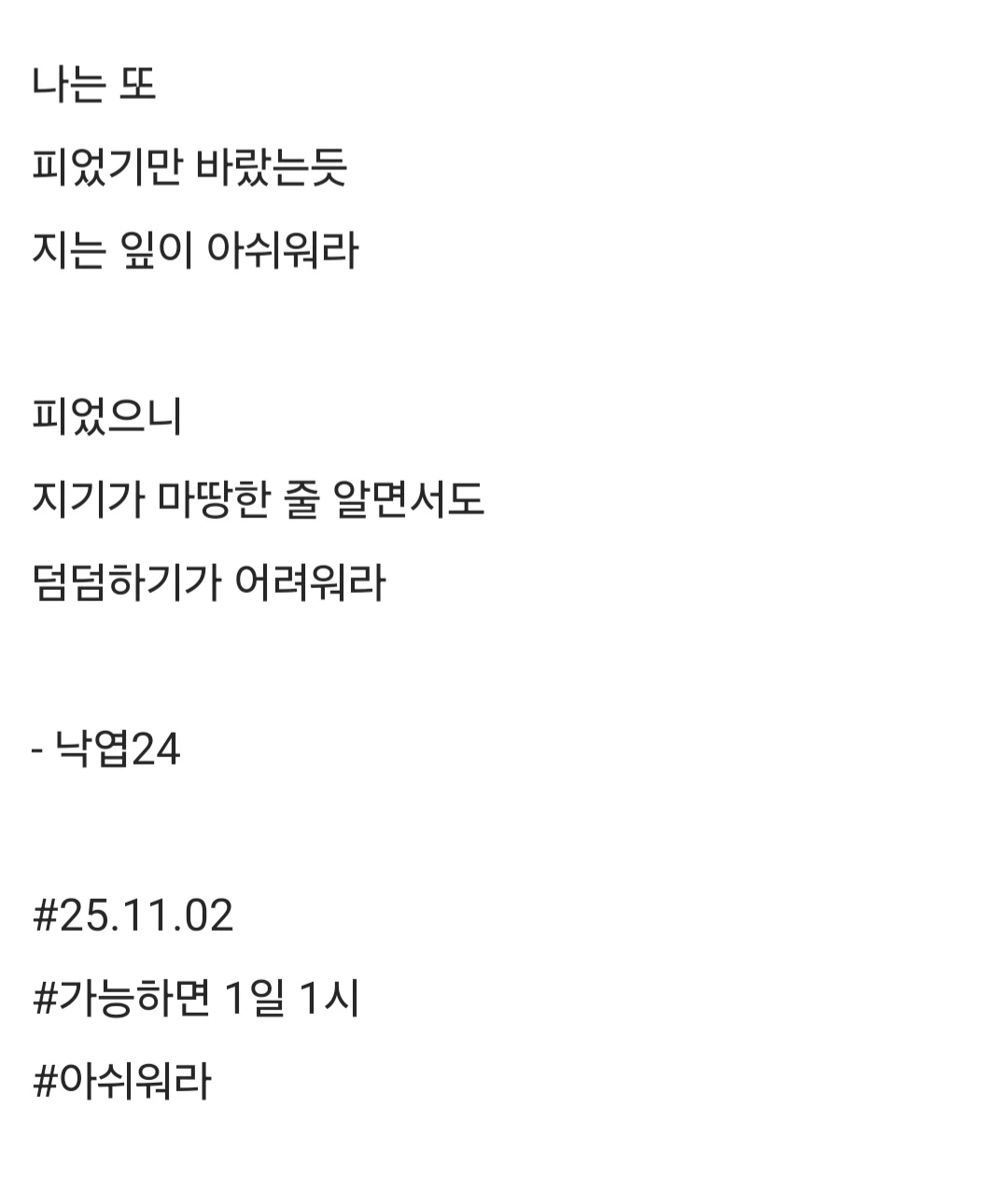나는 또피었기만 바랐는듯지는 잎이 아쉬워라피었으니지기가 마땅한 줄 알면서도덤덤하기가 어려워라- 낙엽24#25.11.02#가능하면 1일 1시 #아쉬워라