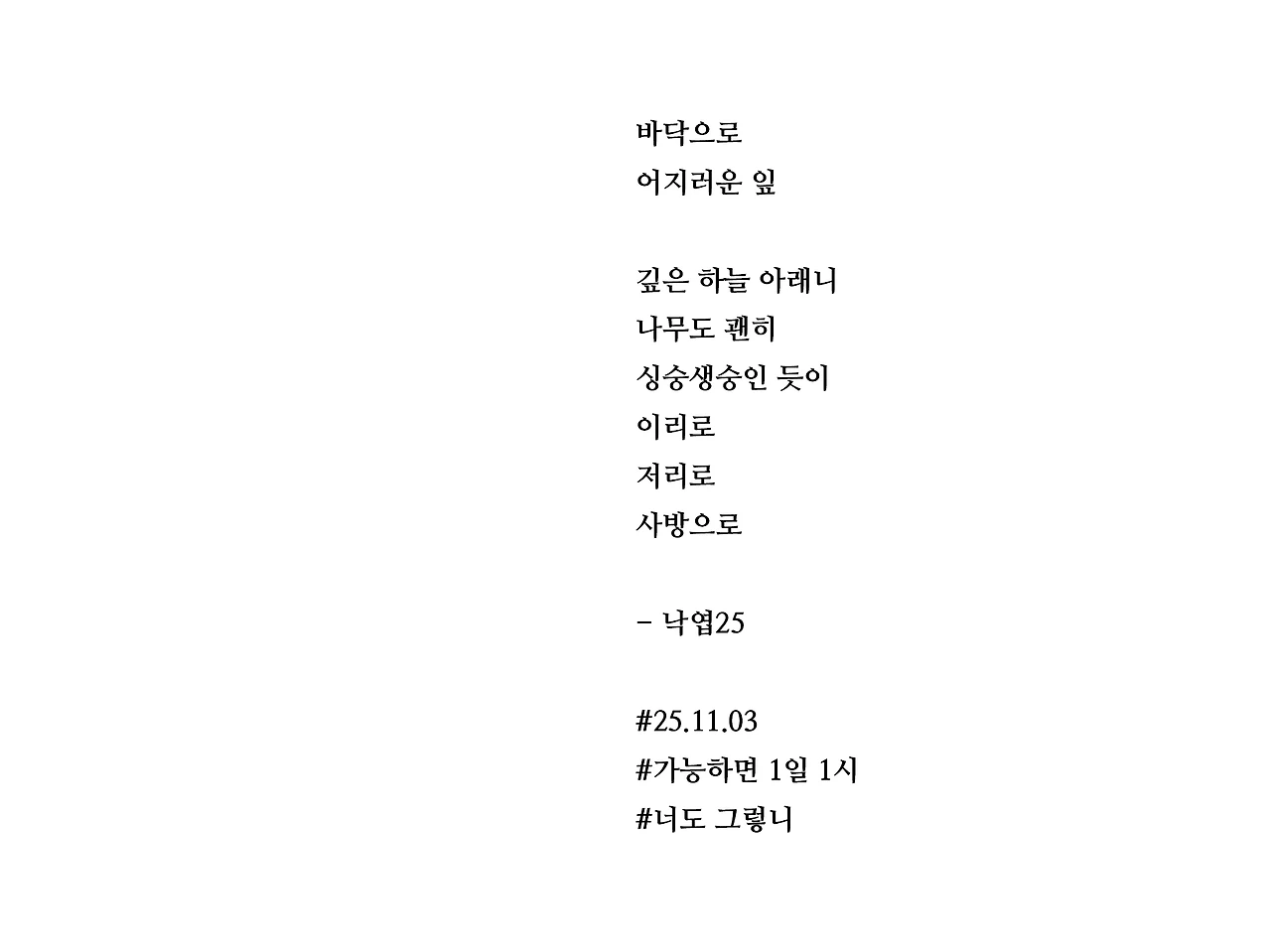 바닥으로어지러운 잎깊은 하늘 아래니나무도 괜히싱숭생숭인 듯이이리로저리로사방으로- 낙엽25#25.11.03#가능하면 1일 1시#너도 그렇니