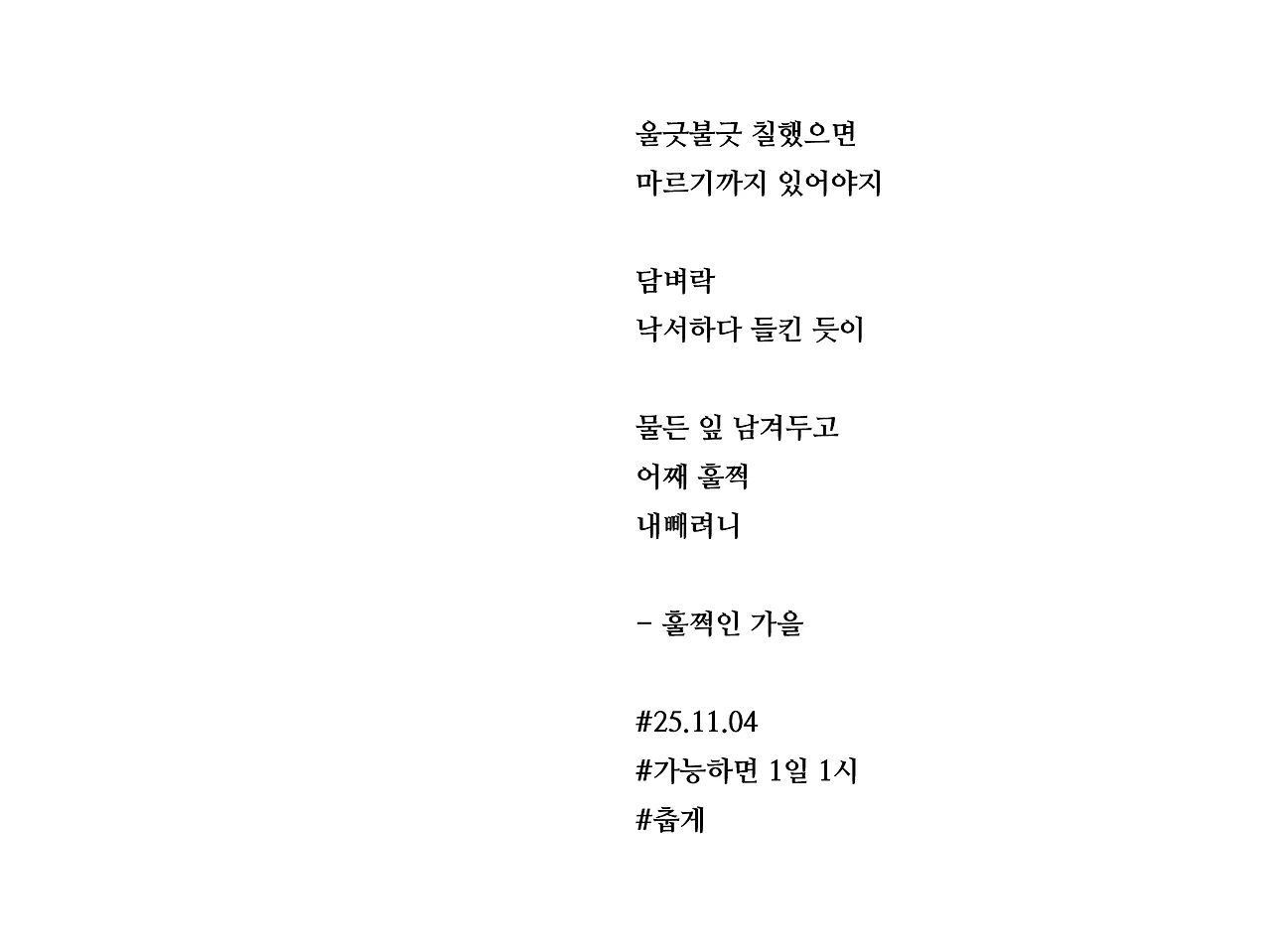 울긋불긋 칠했으면마르기까지 있어야지담벼락낙서하다 들킨 듯이물든 잎 남겨두고어째 훌쩍내빼려니- 훌쩍인 가을#25.11.04#가능하면 1일 1시#춥게