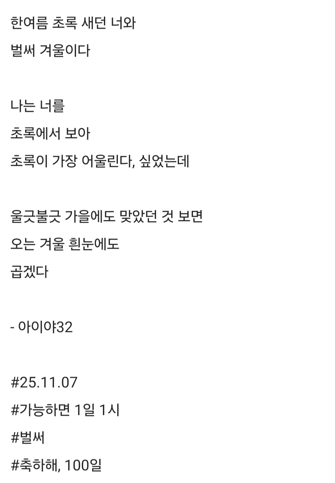 한여름 초록 새던 너와벌써 겨울이다나는 너를초록에서 보아초록이 가장 어울린다, 싶었는데울긋불긋 가을에도 맞았던 것 보면오는 겨울 흰눈에도곱겠다- 아이야32#25.11.07#가능하면 1일 1시#벌써#축하해, 100일