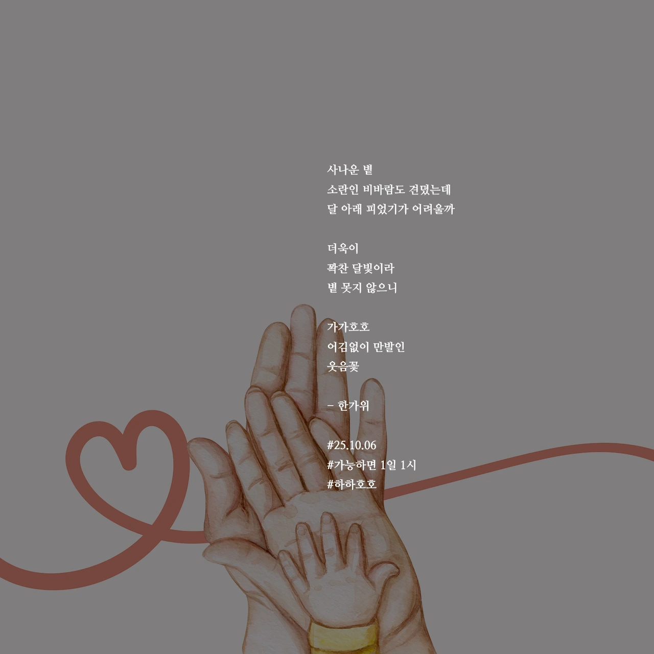 사나운 볕소란인 비바람도 견뎠는데달 아래 피었기가 어려울까더욱이꽉찬 달빛이라볕 못지 않으니가가호호어김없이 만발인웃음꽃- 한가위#25.10.06#가능하면 1일 1시#하하호호 작가의 말: 가득인