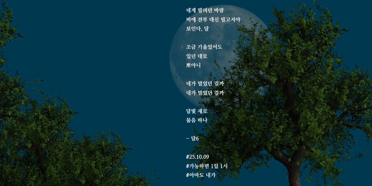 네게 빌려던 바람비에 전부 대신 빌고서야보인다, 달조금 기울었어도있던 대로뽀야니네가 멀었던 걸까내가 멀었던 걸까달빛 새로물음 하나- 달6#25.10.09#가능하면 1일 1시#아마도 내가 작가의 말: 내 눈이 멀어서