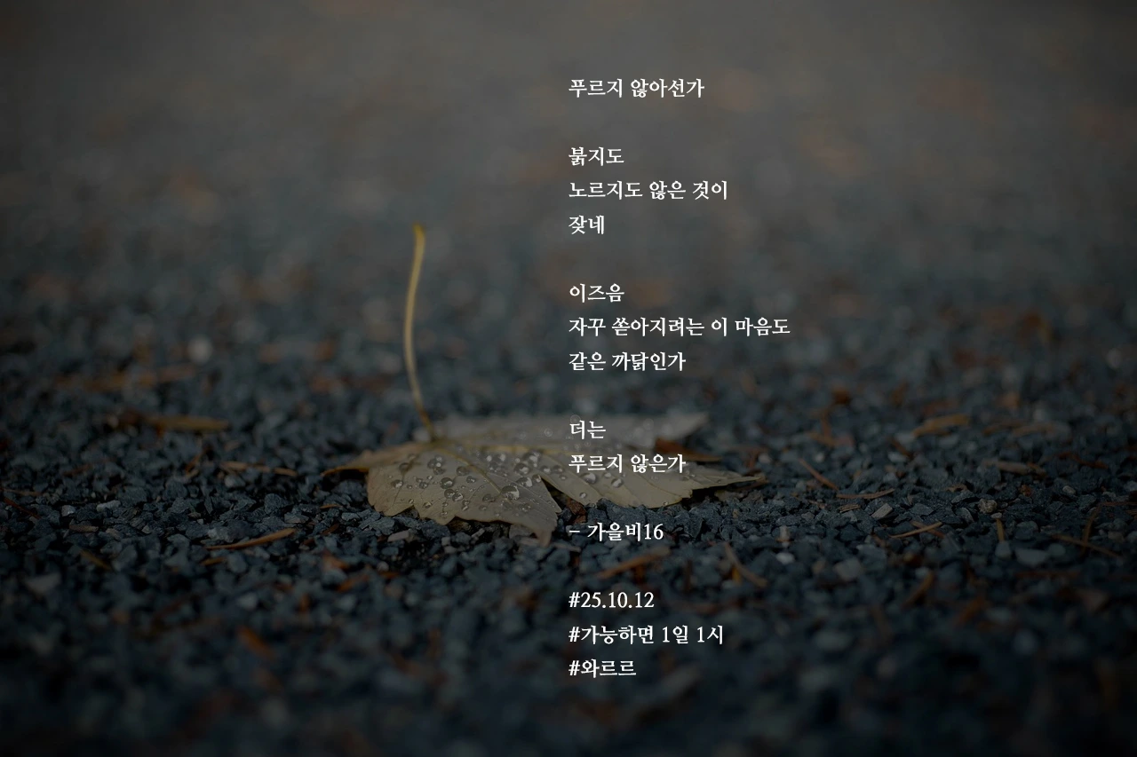 푸르지 않아선가붉지도노르지도 않은 것이잦네이즈음자꾸 쏟아지려는 이 마음도같은 까닭인가더는푸르지 않은가- 가을비16#25.10.12#가능하면 1일 1시 #와르르 작가의 말: 제법 물들어 와르르르