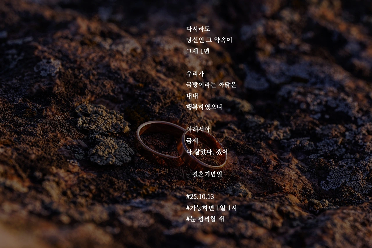 다시라도당신인 그 약속이그새 1년우리가금방이라는 까닭은내내행복하였으니이래서야금세다 살았다, 겠어- 결혼기념일#25.10.13#가능하면 1일 1시#눈 깜짝할 새