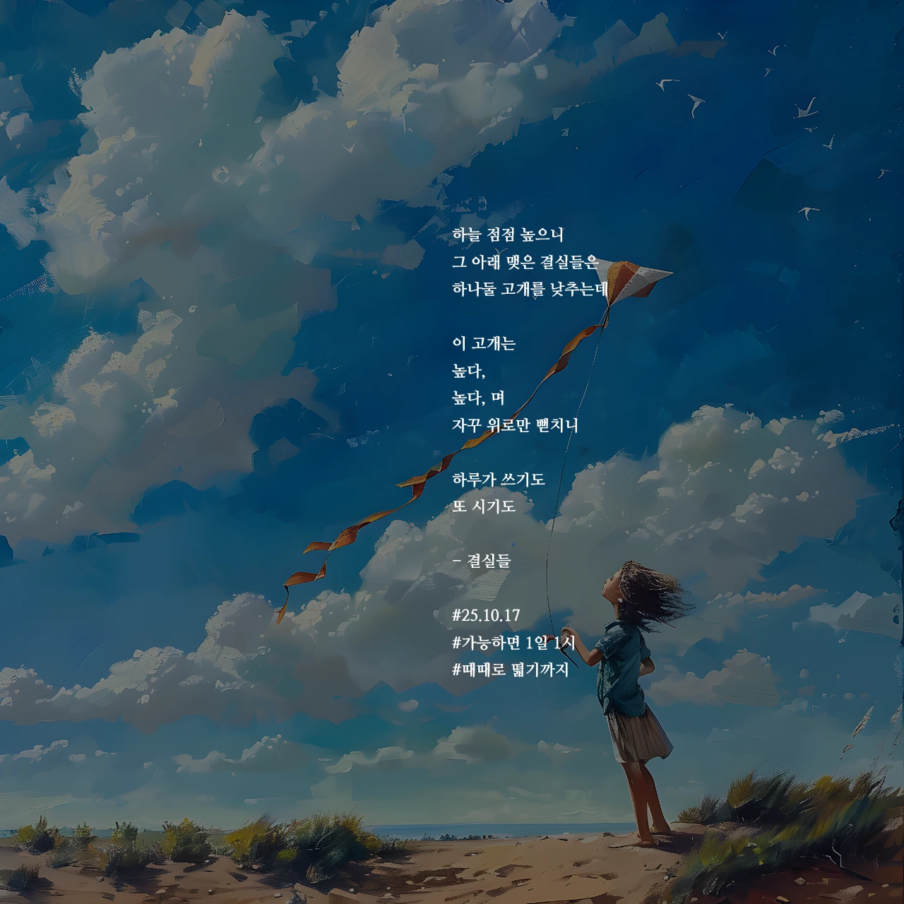 하늘 점점 높으니그 아래 맺은 결실들은하나둘 고개를 낮추는데이 고개는높다,높다, 며자꾸 위로만 뻗치니하루가 쓰기도또 시기도- 결실들#25.10.17#가능하면 1일 1시#때때로 떫기까지