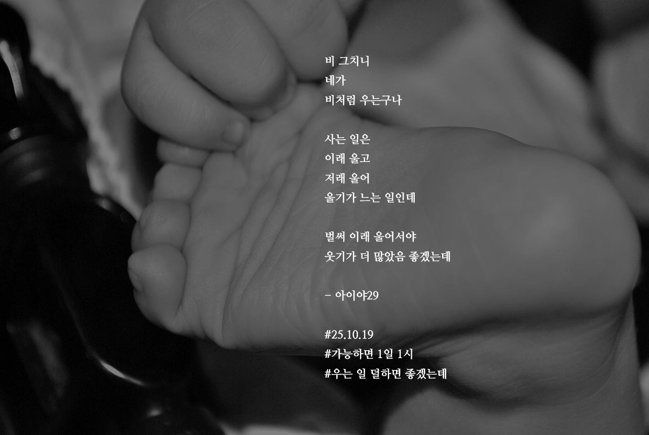 비 그치니네가비처럼 우는구나사는 일은이래 울고저래 울어울기가 느는 일인데벌써 이래 울어서야웃기가 더 많았음 좋겠는데- 아이야29#25.10.19#가능하면 1일 1시#우는 일 덜하면 좋겠는데 작가의 말: 요즘에는 이가 나려는지 울던데