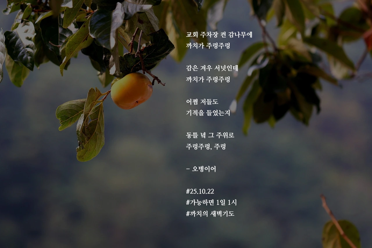 교회 주차장 켠 감나무에까치가 주렁주렁감은 겨우 서넛인데까치가 주렁주렁어쩜 저들도기적을 들었는지동틀 녘 그 주위로주렁주렁, 주렁- 오병이어#25.10.22#가능하면 1일 1시#까치의 새벽기도