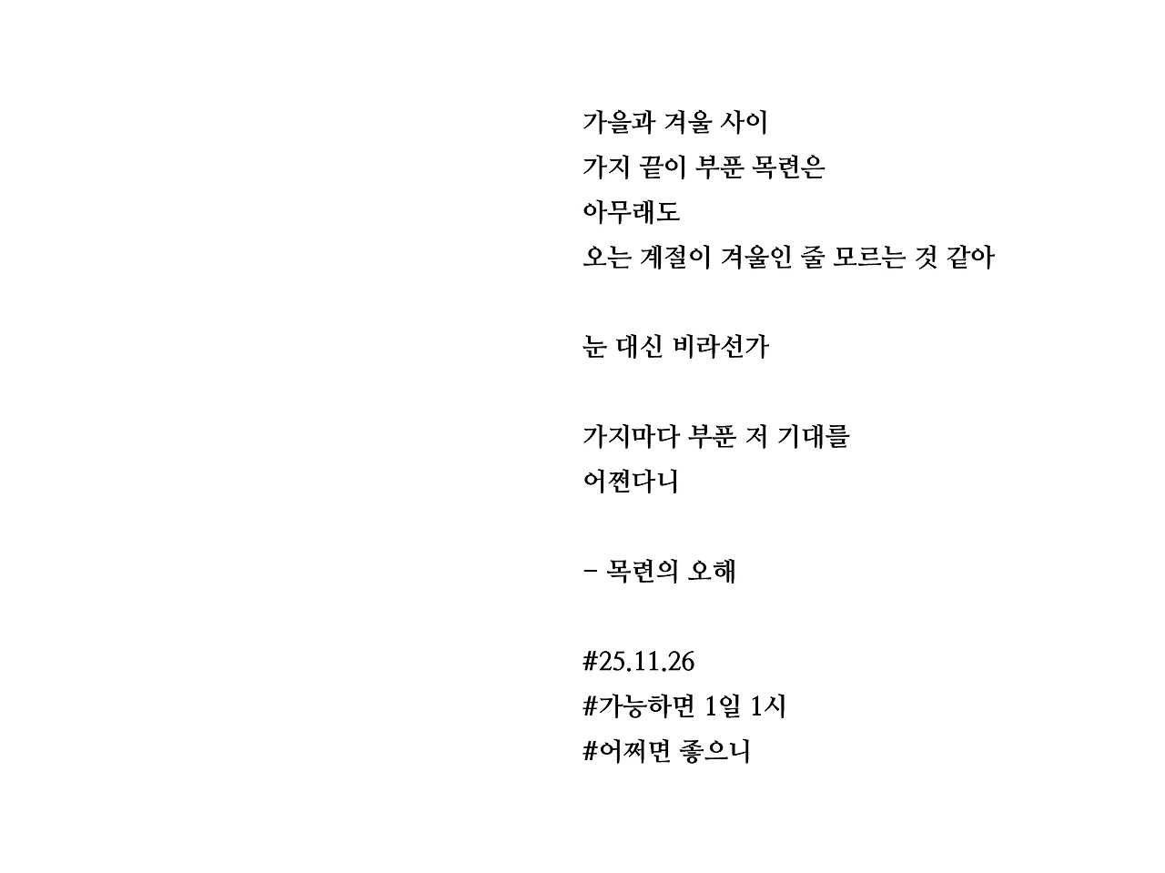 가을과 겨울 사이가지 끝이 부푼 목련은아무래도오는 계절이 겨울인 줄 모르는 것 같아눈 대신 비라선가가지마다 부푼 저 기대를어쩐다니- 목련의 오해#25.11.26#가능하면 1일 1시#어쩌면 좋으니