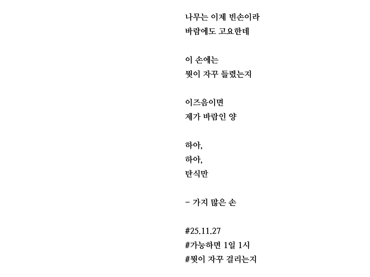 나무는 이제 빈손이라바람에도 고요한데이 손에는뭣이 자꾸 들렸는지이즈음이면제가 바람인 양하아,하아,탄식만- 가지 많은 손#25.11.27#가능하면 1일 1시#뭣이 자꾸 걸리는지
