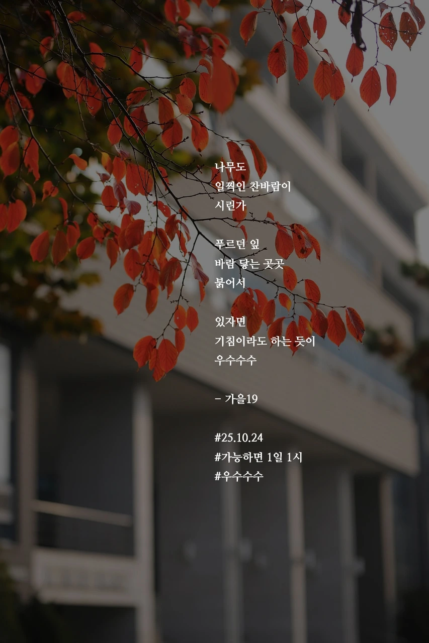 나무도일찍인 찬바람이시린가푸르던 잎바람 닿는 곳곳붉어서있자면기침이라도 하는 듯이우수수수- 가을19#25.10.24#가능하면 1일 1시#우수수수 작가의 말: 네 기침이 그치면 겨울이구나