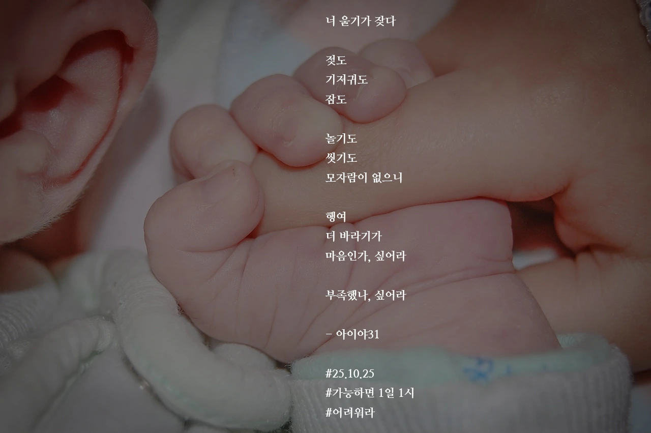 너 울기가 잦다젖도기저귀도잠도놀기도씻기도모자람이 없으니행여더 바라기가마음인가, 싶어라부족했나, 싶어라- 아이야31#25.10.25#가능하면 1일 1시#어려워라 작가의 말: 줘도 줘도 모자란 것 같은