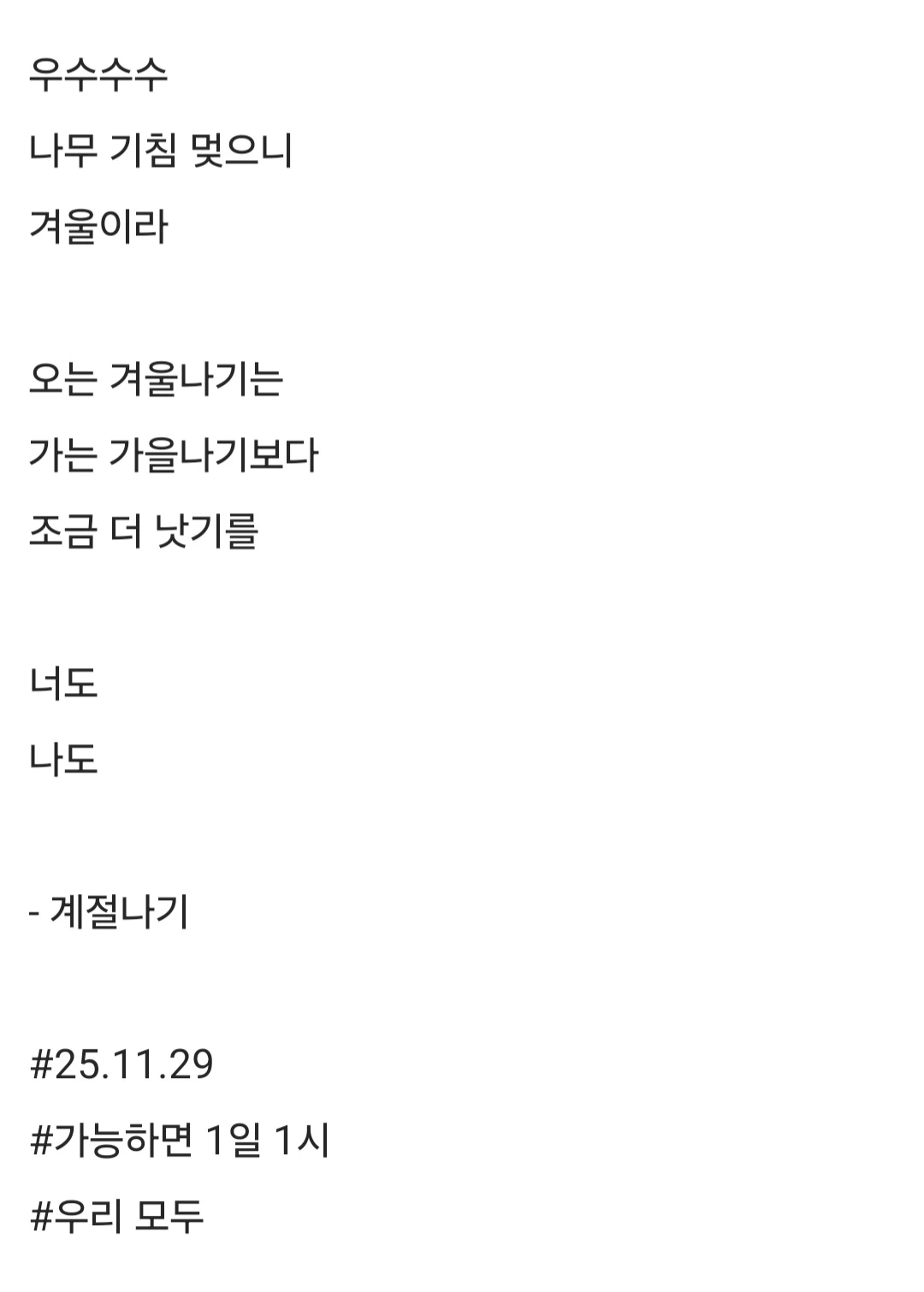 우수수수나무 기침 멎으니겨울이라오는 겨울나기는가는 가을나기보다조금 더 낫기를너도나도- 계절나기#25.11.29#가능하면 1일 1시#우리 모두