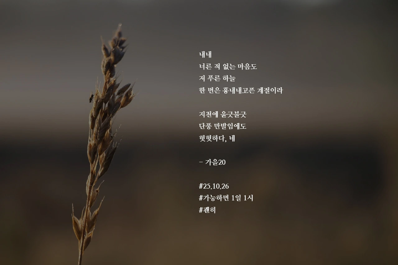 내내너른 적 없는 마음도저 푸른 하늘한 번은 흉내내고픈 계절이라지천에 울긋불긋단풍 만발임에도헛헛하다, 네- 가을20#25.10.26#가능하면 1일 1시#괜히 작가의 말: 오는 겨울은 꽉차기를