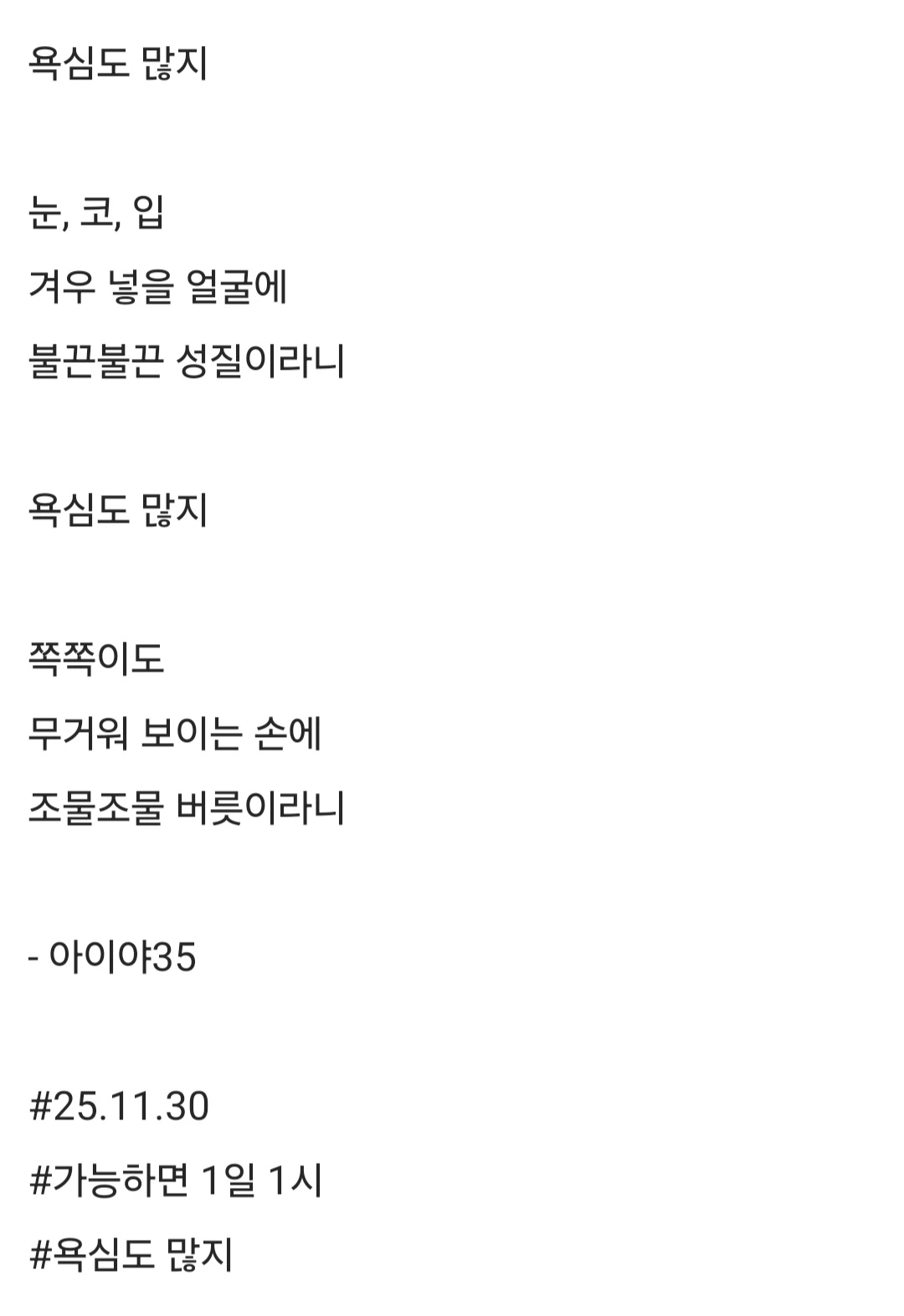 욕심도 많지눈, 코, 입겨우 넣을 얼굴에불끈불끈 성질이라니욕심도 많지쪽쪽이도무거워 보이는 손에조물조물 버릇이라니- 아이야35#25.11.30#가능하면 1일 1시#욕심도 많지