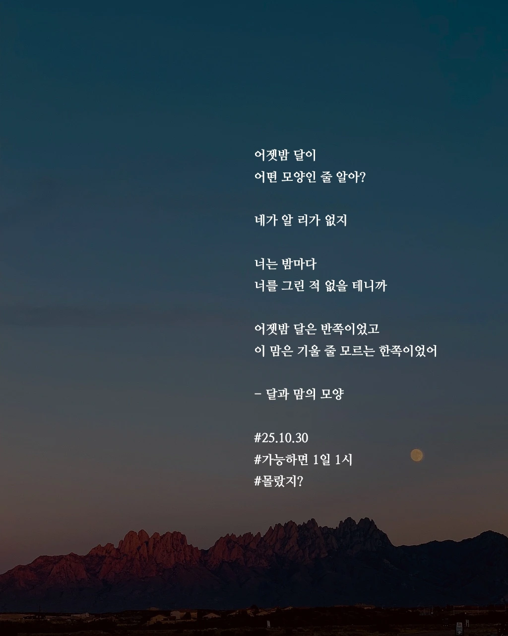 어젯밤 달이어떤 모양인 줄 알아?네가 알 리가 없지너는 밤마다너를 그린 적 없을 테니까어젯밤 달은 반쪽이었고이 맘은 기울 줄 모르는 한쪽이었어- 달과 맘의 모양#25.10.30#가능하면 1일 1시#몰랐지?