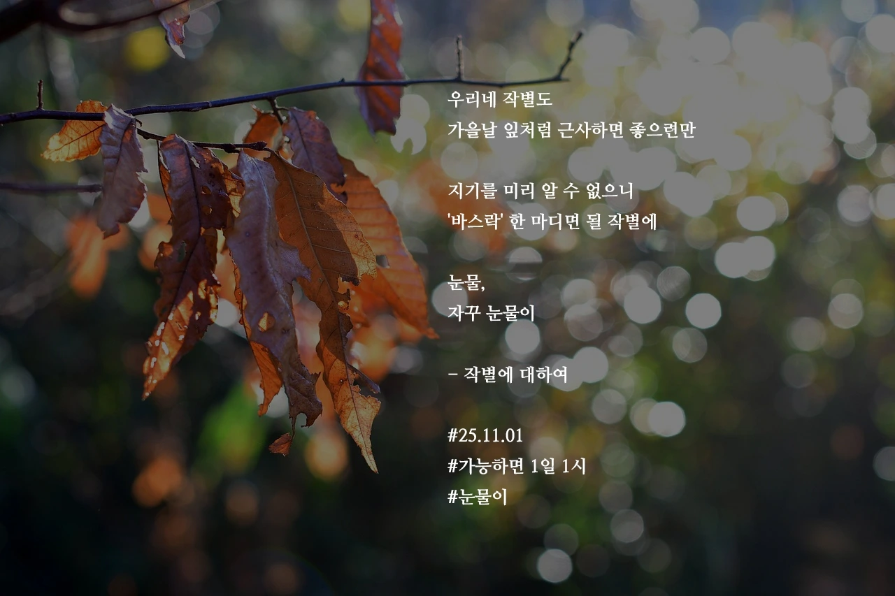 우리네 작별도가을날 잎처럼 근사하면 좋으련만지기를 미리 알 수 없으니'바스락' 한 마디면 될 작별에눈물,자꾸 눈물이- 작별에 대하여#25.11.01#가능하면 1일 1시#눈물이 작가의 말: 알았다면 덜 울었을 텐데