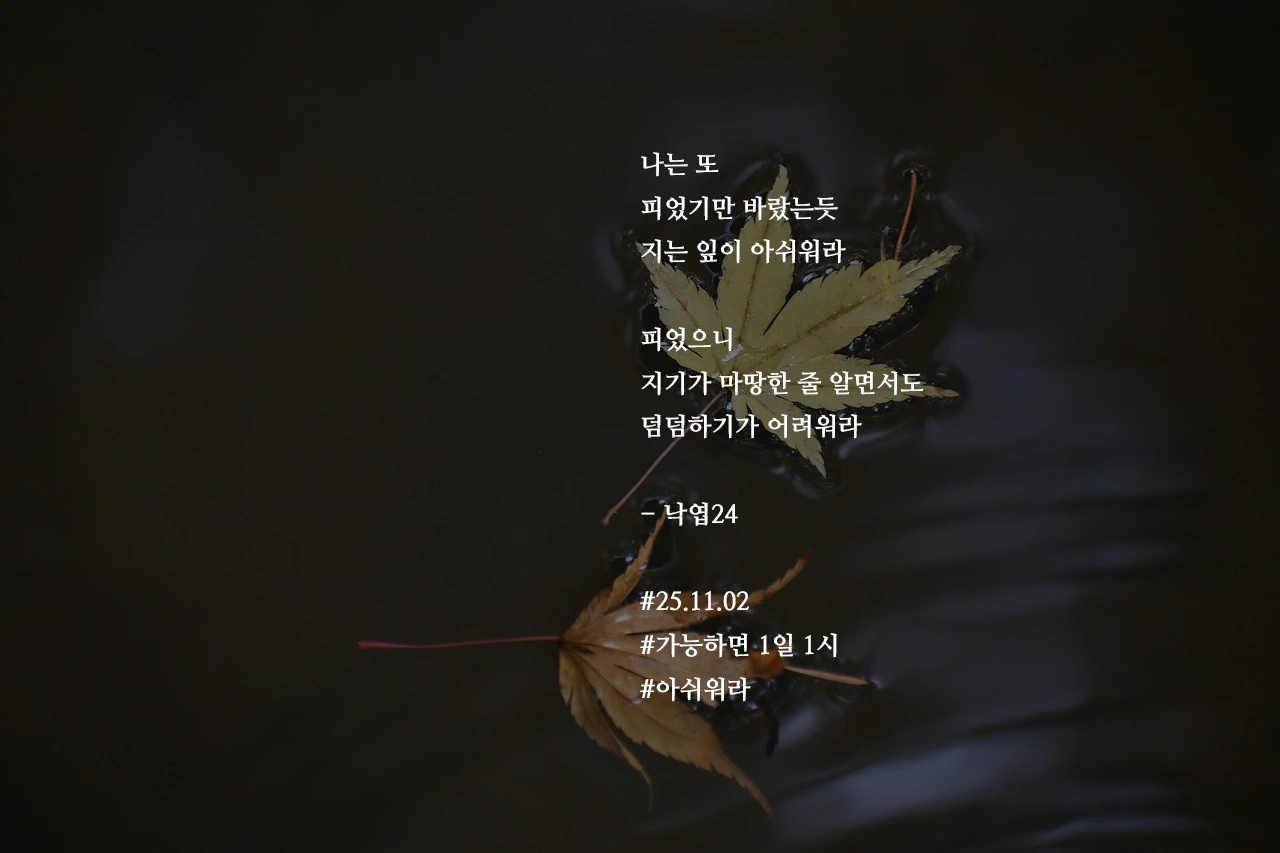 나는 또피었기만 바랐는듯지는 잎이 아쉬워라피었으니지기가 마땅한 줄 알면서도덤덤하기가 어려워라- 낙엽24#25.11.02#가능하면 1일 1시 #아쉬워라 작가의 말: 알면서도 어려워라