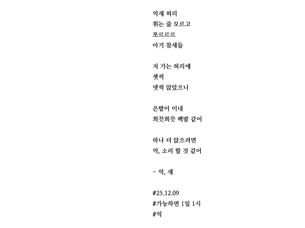 억새 허리휘는 줄 모르고쪼르르르아기 참새들저 가는 허리에셋씩넷씩 앉았으니은발이 이내희끗희끗 백발 같어 하나 더 앉으려면억, 소리 할 것 같어- 억, 새#25.12.09#가능하면 1일 1시#억