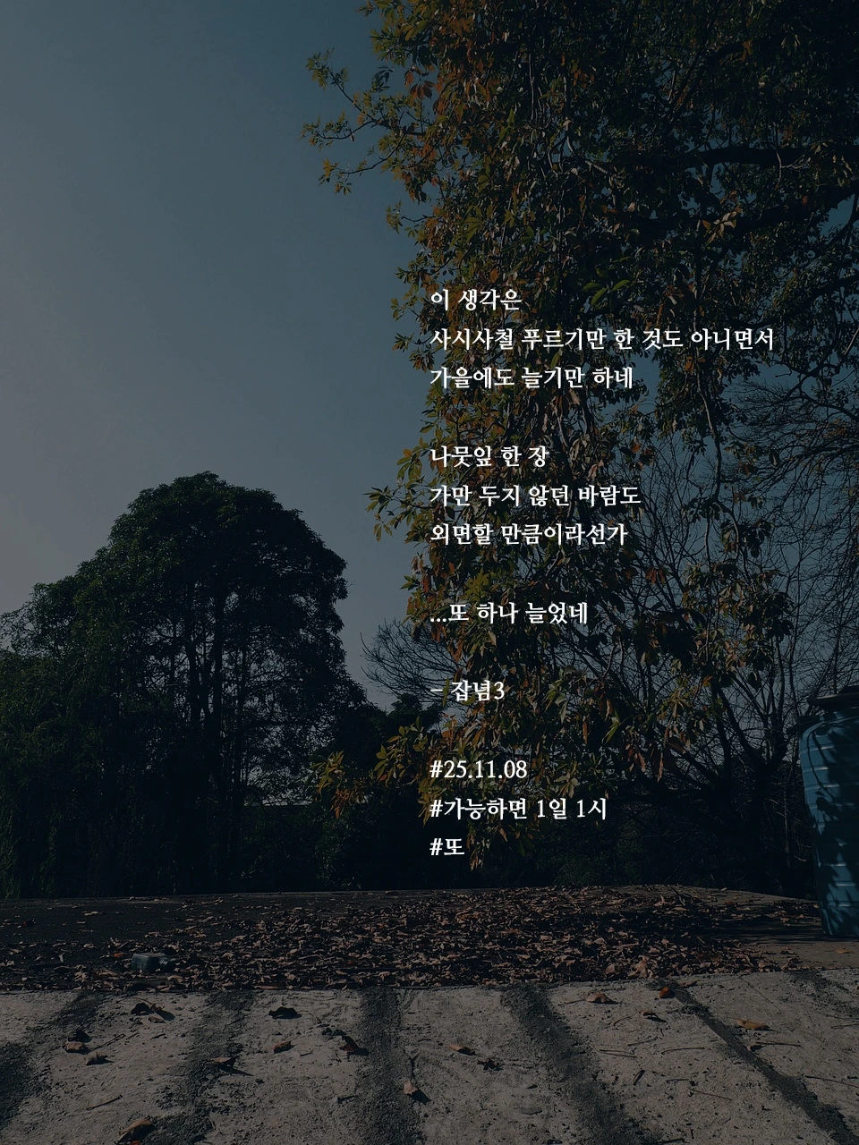 이 생각은사시사철 푸르기만 한 것도 아니면서가을에도 늘기만 하네나뭇잎 한 장가만 두지 않던 바람도외면할 만큼이라선가...또 하나 늘었네- 잡념3#25.11.08#가능하면 1일 1시#또 작가의 말: 행복 하나만 떠올리는 겨울이기를