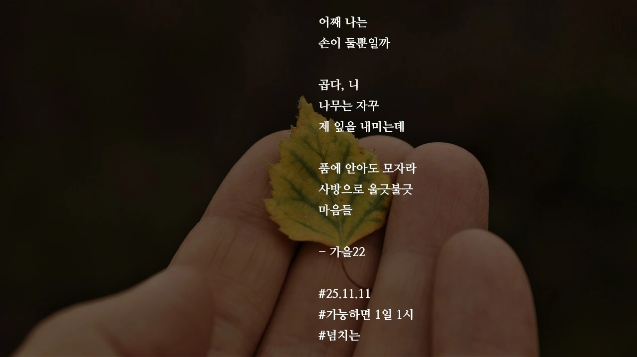 어째 나는손이 둘뿐일까곱다, 니나무는 자꾸제 잎을 내미는데품에 안아도 모자라사방으로 울긋불긋마음들- 가을22#25.11.11#가능하면 1일 1시#넘치는