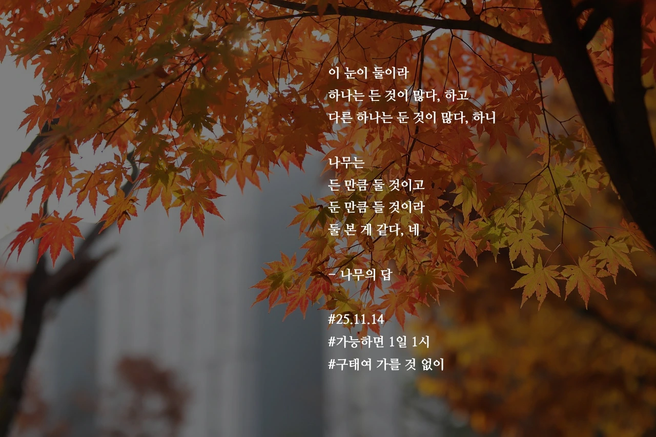 이 눈이 둘이라하나는 든 것이 많다, 하고다른 하나는 둔 것이 많다, 하니나무는든 만큼 둘 것이고둔 만큼 들 것이라둘 본 게 같다, 네- 나무의 답#25.11.14#가능하면 1일 1시#구태여 가를 것 없이