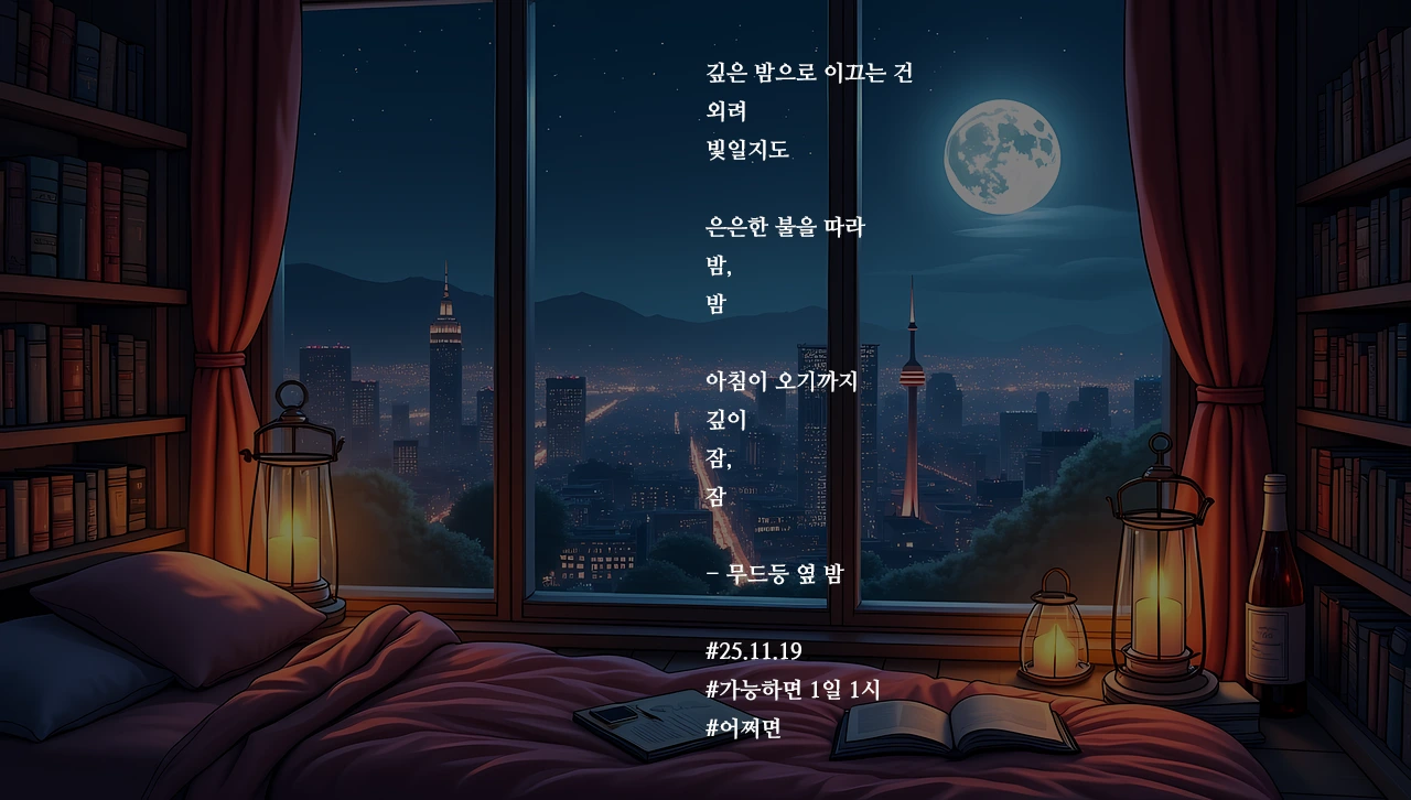 깊은 밤으로 이끄는 건외려빛일지도은은한 불을 따라밤,밤아침이 오기까지깊이잠,잠- 무드등 옆 밤#25.11.19#가능하면 1일 1시#어쩌면