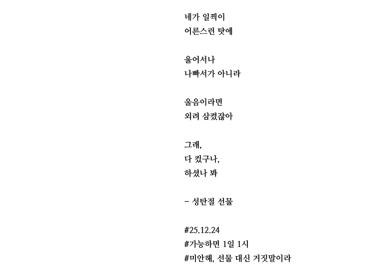 네가 일찍이어른스런 탓에울어서나나빠서가 아니라울음이라면외려 삼켰잖아그래,다 컸구나,하셨나 봐- 성탄절 선물#25.12.24#가능하면 1일 1시#미안해, 선물 대신 거짓말이라