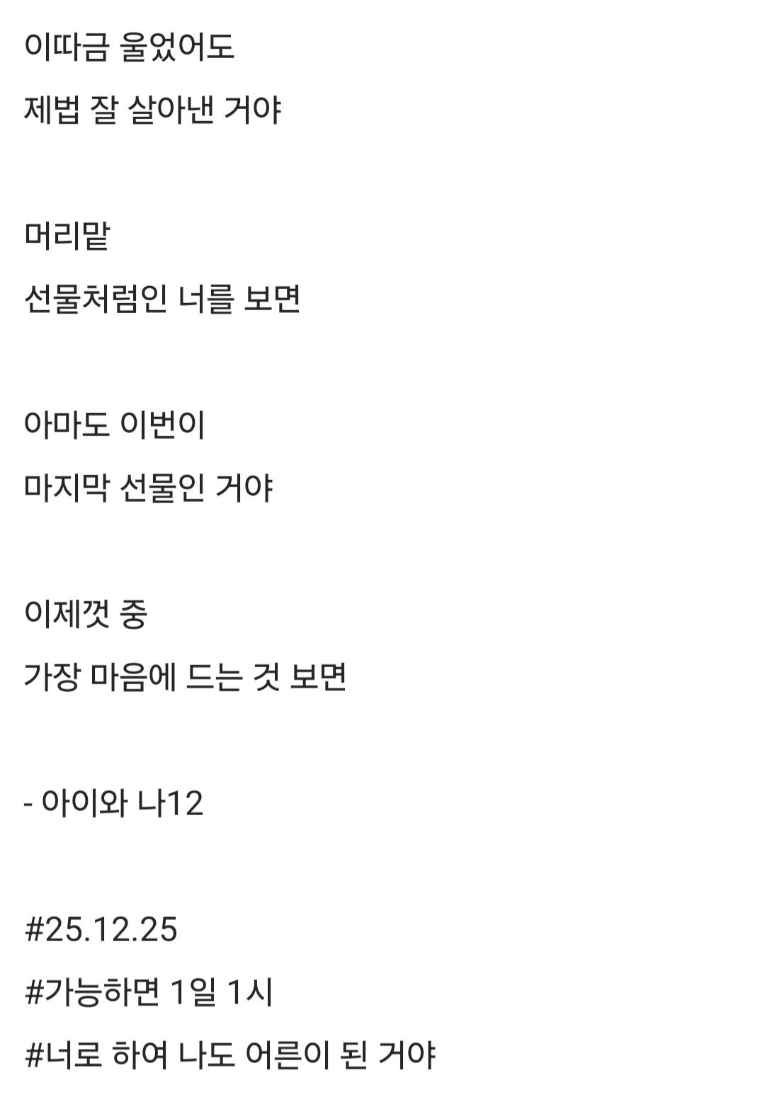 이따금 울었어도제법 잘 살아낸 거야머리맡선물처럼인 너를 보면아마도 이번이마지막 선물인 거야이제껏 중가장 마음에 드는 것 보면- 아이와 나12#25.12.25#가능하면 1일 1시#너로 하여 나도 어른이 된 거야
