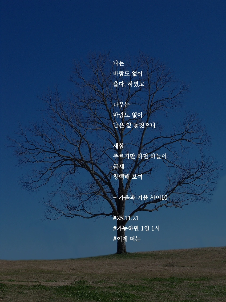 나는바람도 없이춥다, 하였고나무는바람도 없이남은 잎 놓쳤으니새삼푸르기만 하던 하늘이금세창백해 보여- 가을과 겨울 사이10#25.11.21#가능하면 1일 1시#이제 더는