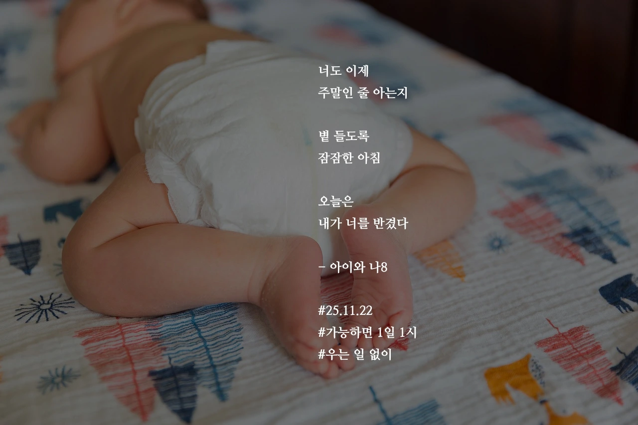 너도 이제주말인 줄 아는지볕 들도록잠잠한 아침오늘은내가 너를 반겼다- 아이와 나8#25.11.22#가능하면 1일 1시#우는 일 없이 작가의 말: 하루가 다르게 커가는 너와 따라 가기 바쁜 나
