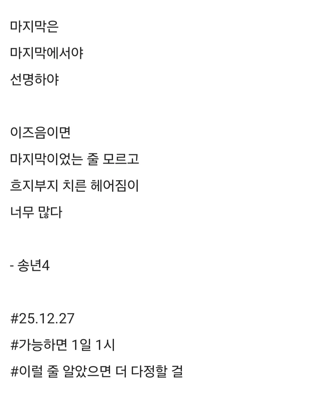 마지막은마지막에서야선명하야이즈음이면마지막이었는 줄 모르고흐지부지 치른 헤어짐이너무 많다- 송년4#25.12.27#가능하면 1일 1시#이럴 줄 알았으면 더 다정할 걸