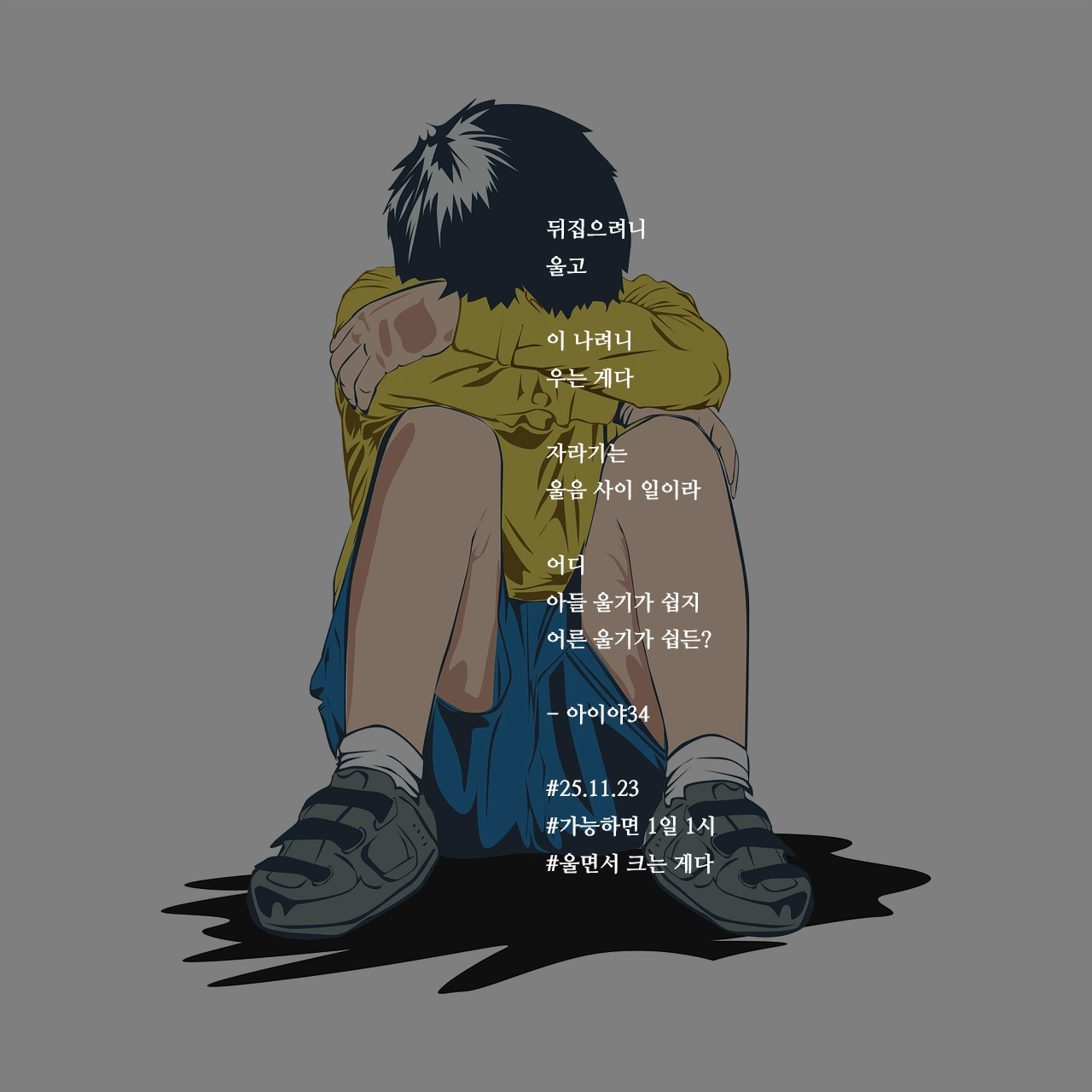 뒤집으려니울고이 나려니우는 게다자라기는울음 사이 일이라어디아들 울기가 쉽지어른 울기가 쉽든?- 아이야34#25.11.23#가능하면 1일 1시#울면서 크는 게다 작가의 말: 나도 여태 울며 크는 것 같은데