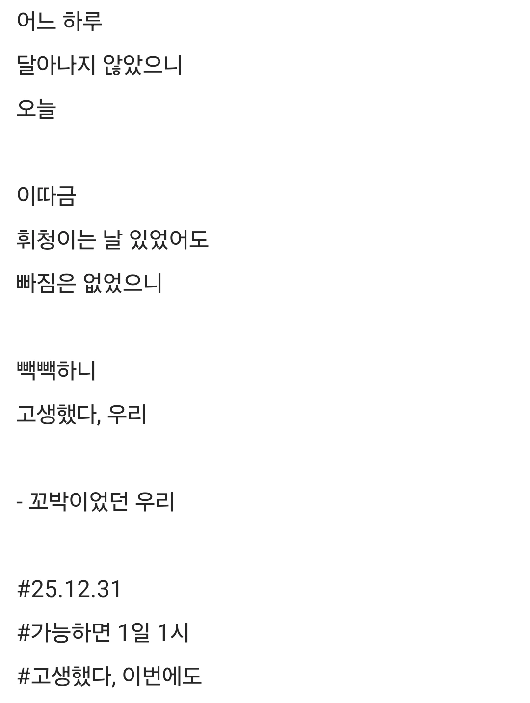 어느 하루달아나지 않았으니오늘이따금휘청이는 날 있었어도빠짐은 없었으니빽빽하니고생했다, 우리- 꼬박이었던 우리#25.12.31#가능하면 1일 1시#고생했다, 이번에도