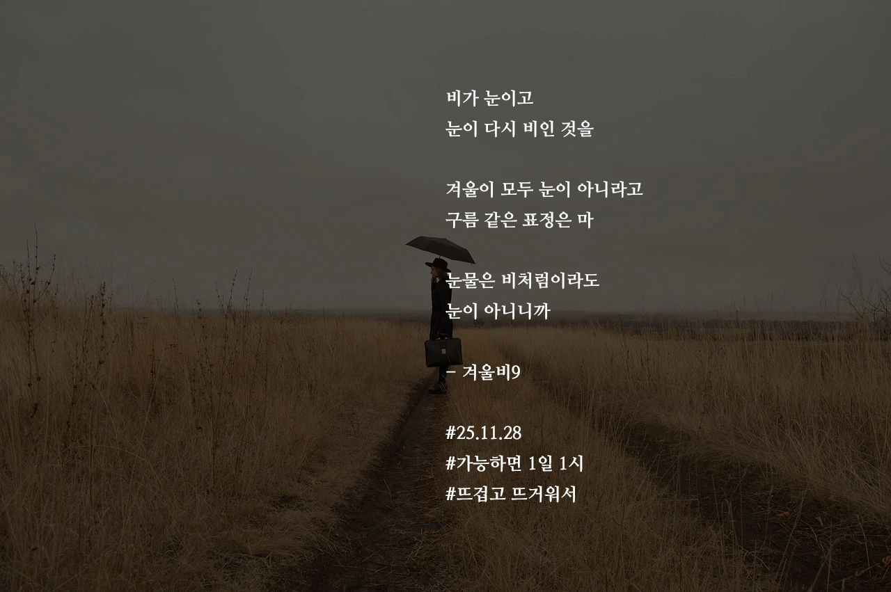 비가 눈이고눈이 다시 비인 것을겨울이 모두 눈이 아니라고구름 같은 표정은 마눈물은 비처럼이라도눈이 아니니까- 겨울비9#25.11.28#가능하면 1일 1시#뜨겁고 뜨거워서 작가의 말: 눈물은 다르니까