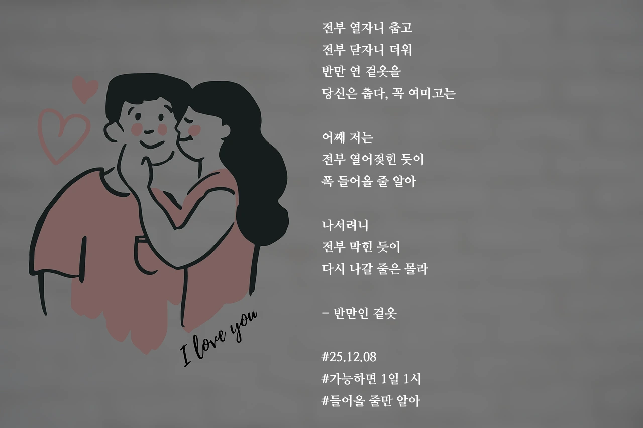 전부 열자니 춥고전부 닫자니 더워반만 연 겉옷을당신은 춥다, 꼭 여미고는어째 저는전부 열어젖힌 듯이폭 들어올 줄 알아나서려니전부 막힌 듯이다시 나갈 줄은 몰라- 반만인 겉옷#25.12.08#가능하면 1일 1시#들어올 줄만 알아