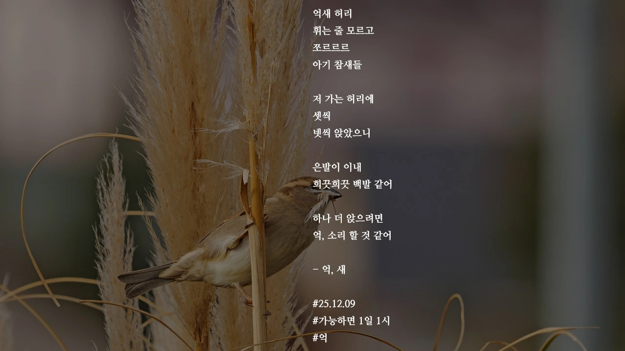 억새 허리휘는 줄 모르고쪼르르르아기 참새들저 가는 허리에셋씩넷씩 앉았으니은발이 이내희끗희끗 백발 같어 하나 더 앉으려면억, 소리 할 것 같어- 억, 새#25.12.09#가능하면 1일 1시#억