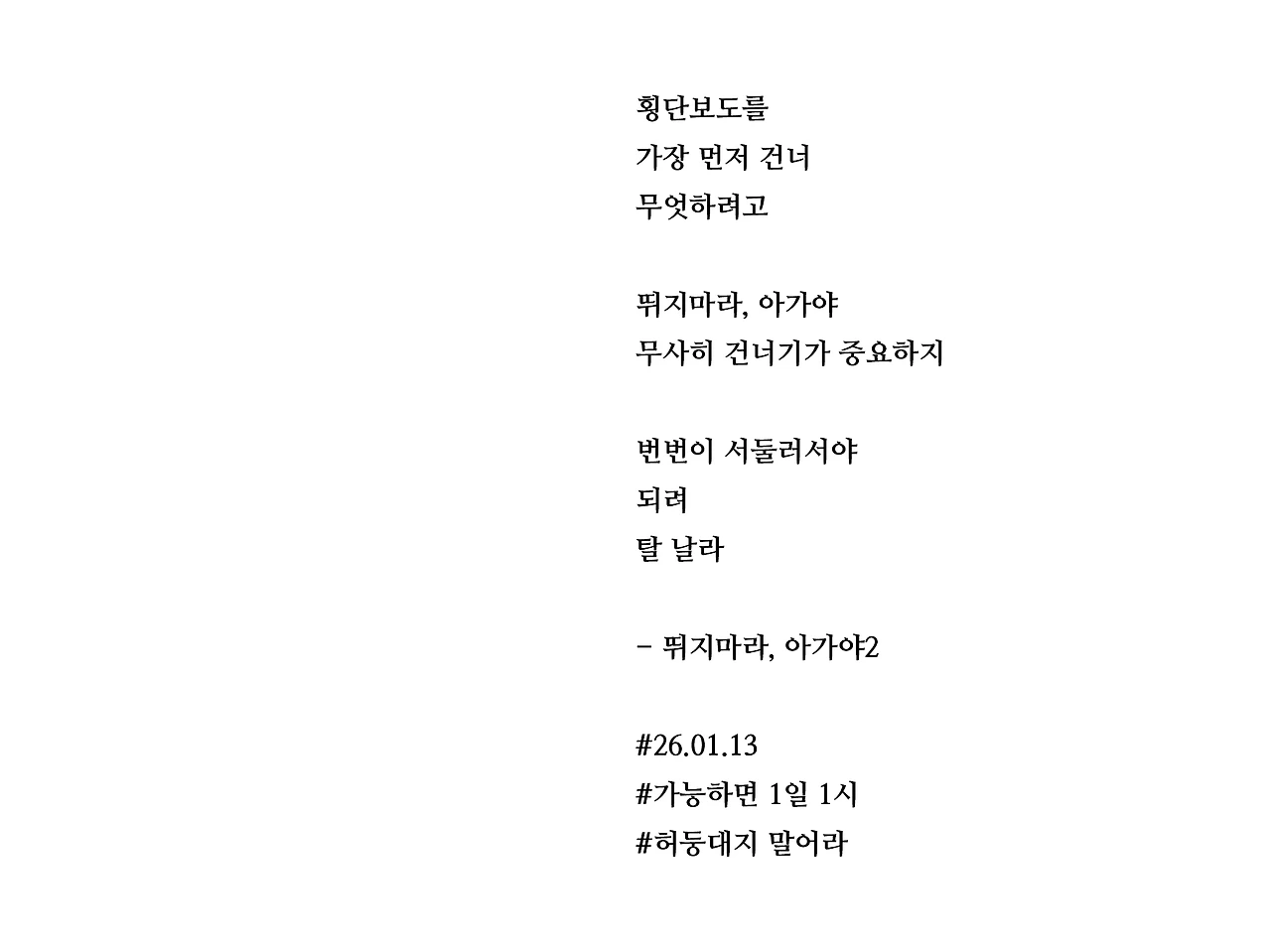 횡단보도를가장 먼저 건너무엇하려고뛰지마라, 아가야무사히 건너기가 중요하지번번이 서둘러서야되려탈 날라- 뛰지마라, 아가야2#26.01.13#가능하면 1일 1시#허둥대지 말어라
