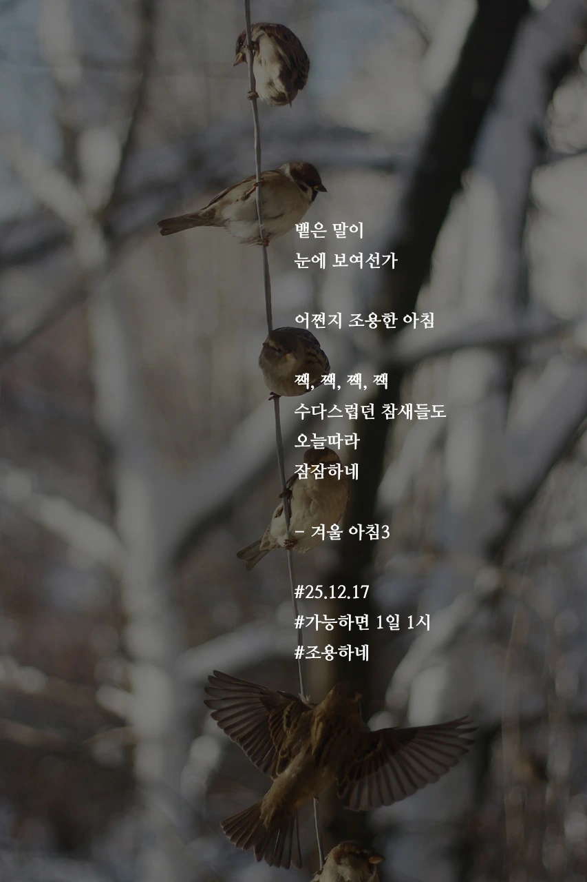 뱉은 말이눈에 보여선가어쩐지 조용한 아침짹, 짹, 짹, 짹수다스럽던 참새들도오늘따라잠잠하네- 겨울 아침3#25.12.17#가능하면 1일 1시#조용하네