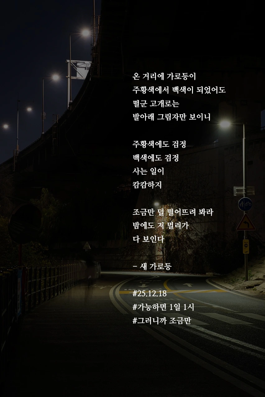 온 거리에 가로등이주황색에서 백색이 되었어도떨군 고개로는발아래 그림자만 보이니주황색에도 검정백색에도 검정사는 일이캄캄하지조금만 덜 떨어뜨려 봐라밤에도 저 멀리가다 보인다- 새 가로등#25.12.18#가능하면 1일 1시#그러니까 조금만