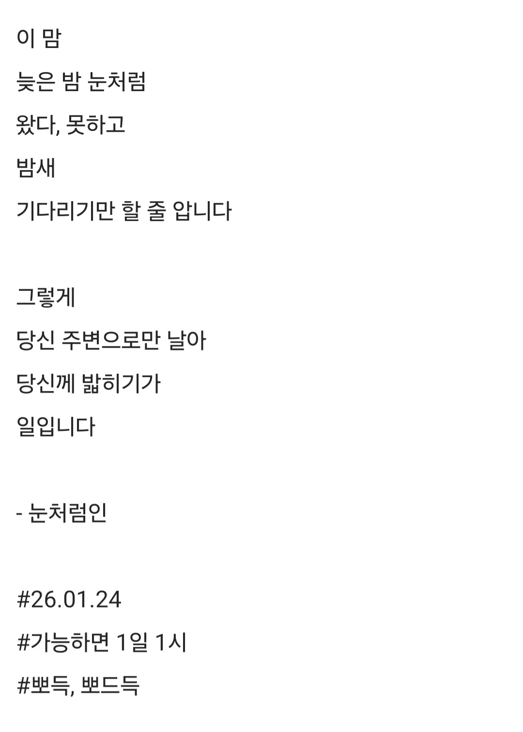 이 맘늦은 밤 눈처럼왔다, 못하고밤새기다리기만 할 줄 압니다그렇게당신 주변으로만 날아당신께 밟히기가일입니다- 눈처럼인#26.01.24#가능하면 1일 1시#뽀득, 뽀드득